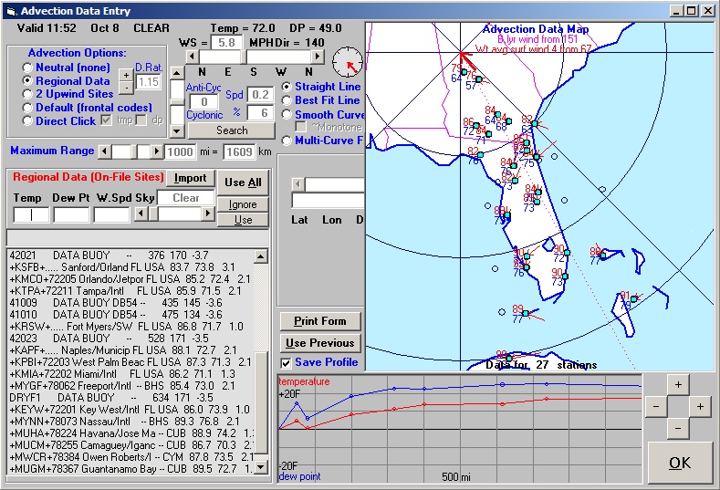 The interrupt planner takes advantage of free, automatically (through WXSIMATE) downloaded GFS data out to 180 hours. This now even includes use of GFS forecast data for advection after wind shifts that occur at any time during the forecast run. This means model data to support WXSIM is available worldwide, out to at least a week. Most people run forecasts between 4 and 7 days.